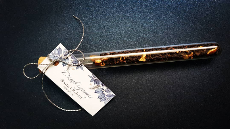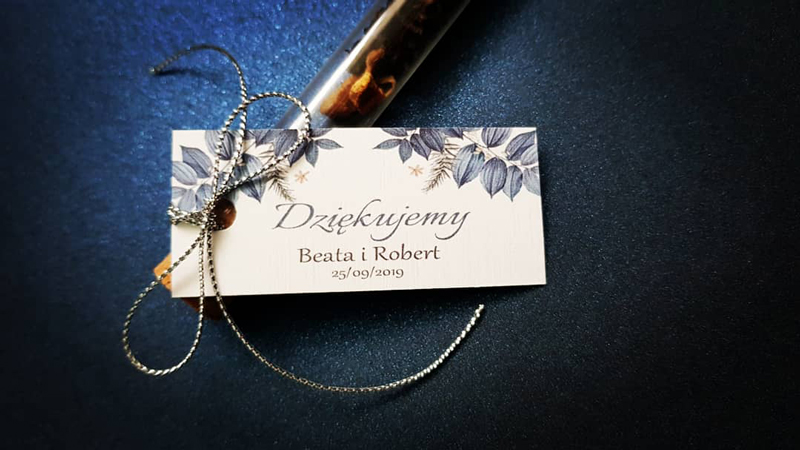 - Personalizowany bilecik z napisem "Dziękujemy", imionami oraz datą