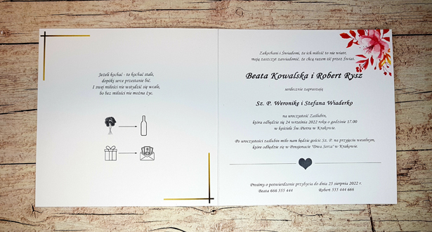 - Ze względu na różne ustawienia monitorów i urządzeń, kolory zaproszeń mogę nie znacznie odbiegać od rzeczywistych