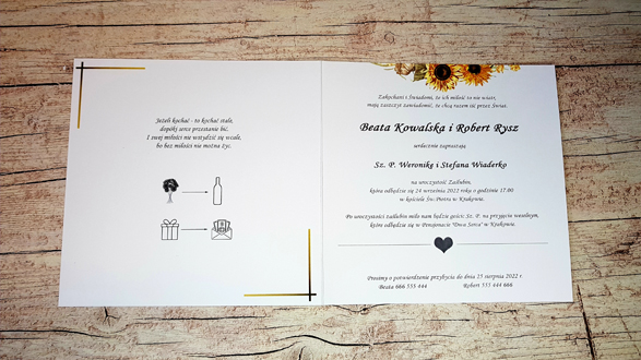 - Cyfrowy druk zaproszenia na wybranym rodzaju papieru w formacie 135 mm x 135 mm (złożone), 135 mm x 270 mm (rozłożone)