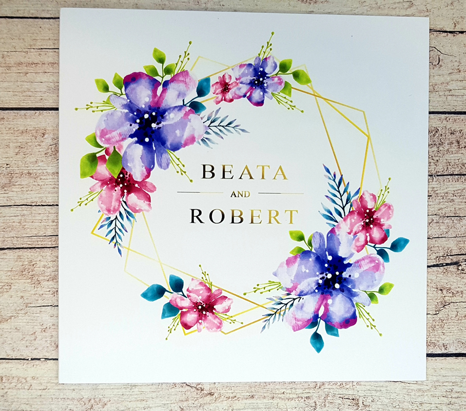 - Cyfrowy druk zaproszenia na wybranym rodzaju papieru w formacie 135 mm x 135 mm (złożone), 135 mm x 270 mm (rozłożone)