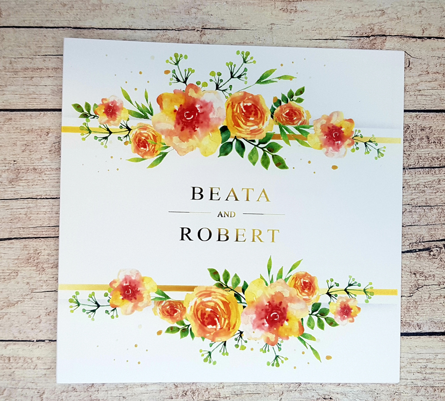 - Cyfrowy druk zaproszenia na wybranym rodzaju papieru w formacie 135 mm x 135 mm (złożone), 135 mm x 270 mm (rozłożone)