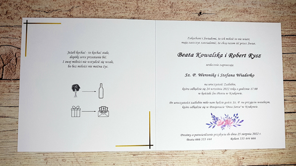 - Ze względu na różne ustawienia monitorów i urządzeń, kolory zaproszeń mogę nie znacznie odbiegać od rzeczywistych